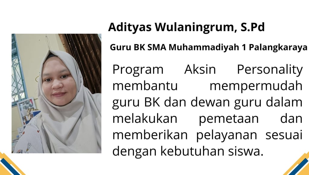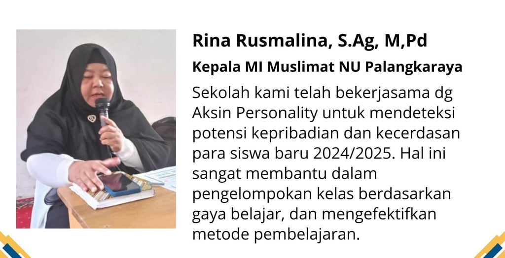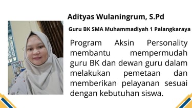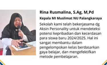 Sekolah kami sudah bekerjasama dengan AKSIN Personality selama dua tahun yaitu mulai TA 2023/2024 dan TA 2024/2025, untuk melakukan tes Asesmen Diagnostik siswa baru melalui metode sidik jari bagi siswa baru kelas X yang berjumlah 500 siswa. Analisa ini sangat membantu sekolah dalam meningkatkan layanan pembelajaran di sekolah juga membantu orang tua dalam memahami anaknya, murid untuk memamahi kemampuan terbaiknya. Hasil tes ini sangat lengkap dan aplikatif yang berbeda dengan tes lainnya.